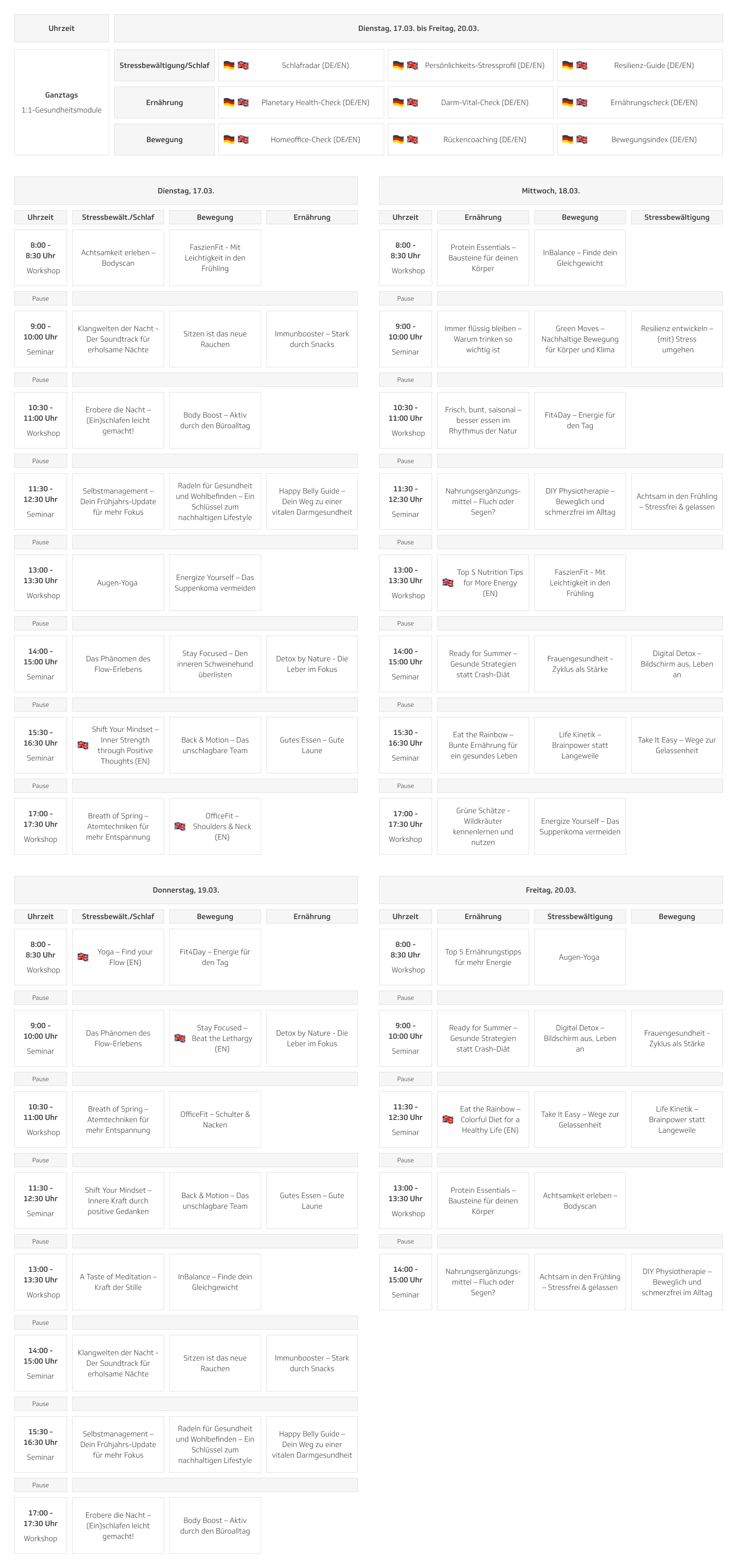 Starten Sie energiegeladen in den Frühling: aktiv, fit und gesund. Entdecken Sie ein vielseitiges Angebot an Online-Workshops und interaktiven Seminaren rund um Bewegung, Motivation und gesunde Ernährung. Erfahren Sie, wie Sie den Frühling nutzen können, um neue Routinen aufzubauen, Kraft zu tanken und Ihrem Körper etwas Gutes zu tun – individuell und kostenfrei.